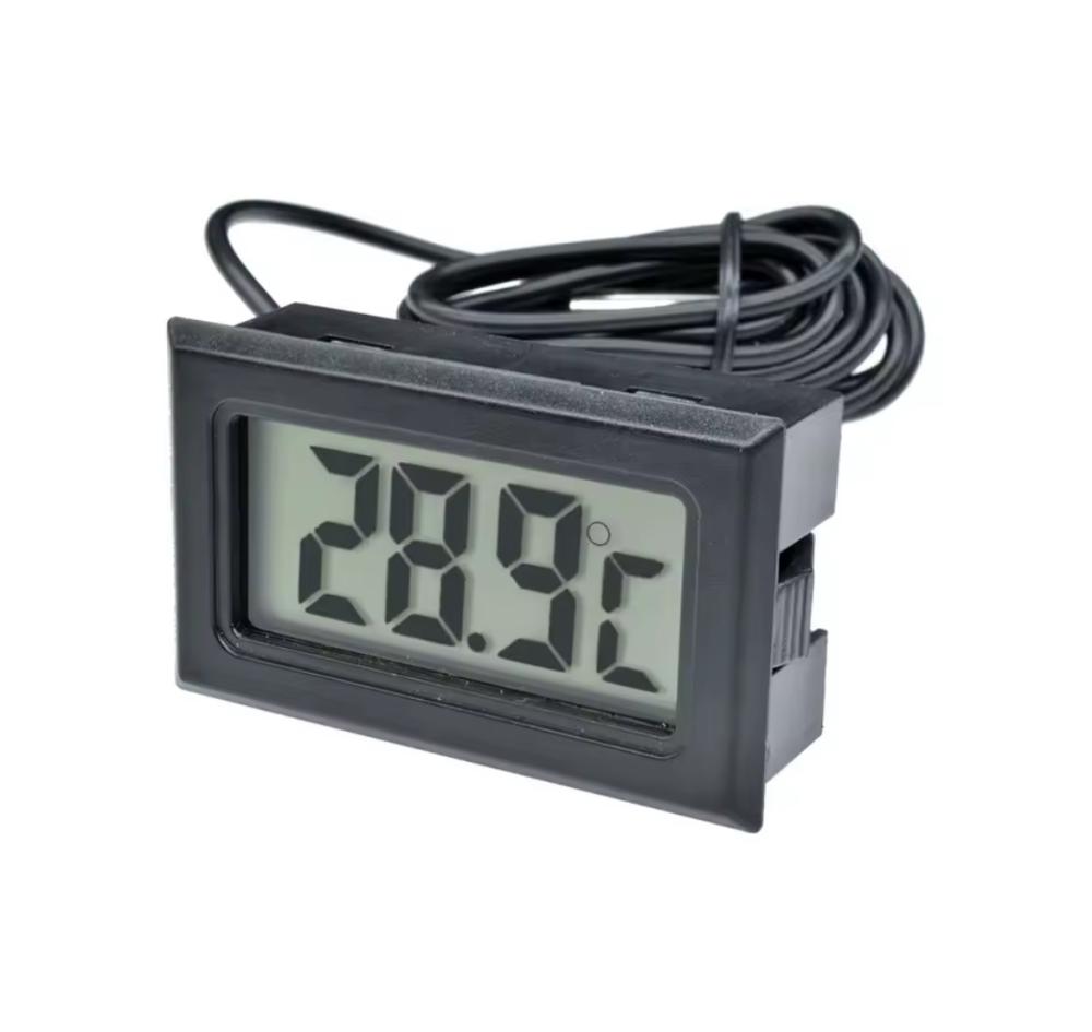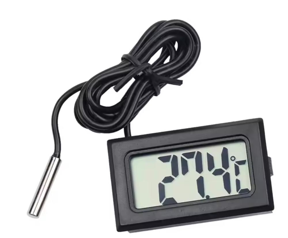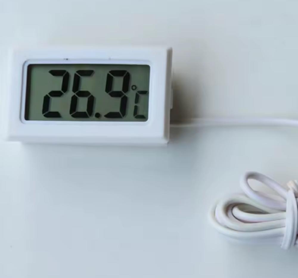 مقياس حرارة إلكتروني رقمي مزود بسلك حساس لقياس درجات الحرارة بدقة في الأماكن المغلقة مثل أقفاص الطيور، الحاضنات، أحواض الزواحف، والمزارع. يتميز بشاشة LCD واضحة وسرعة استجابة عالية، ويعمل بالبطاريات لتوفير استخدام مرن وسهل في أي مكان